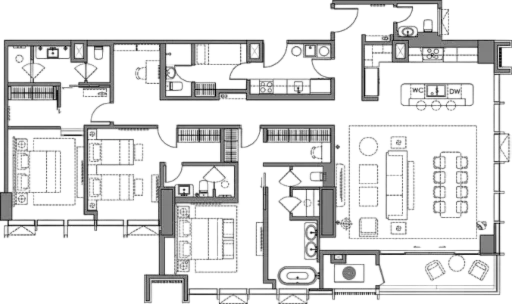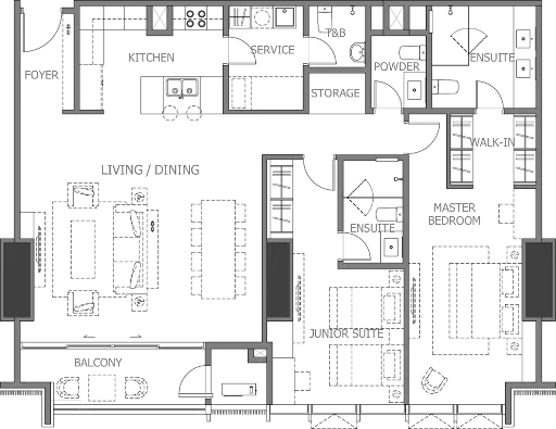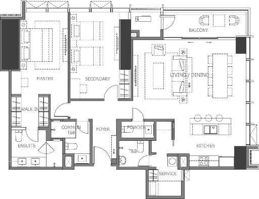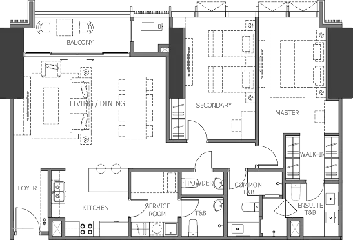 This spacious three-bedroom unit features expansive social areas, a service kitchen, and premium finishes, designed for those who value both style and substance.